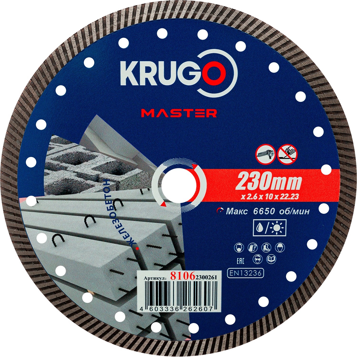 Диск алмазный Турбо по железобетону KRUGO MASTER 230х2,6х22,23х12mm, 81062300261